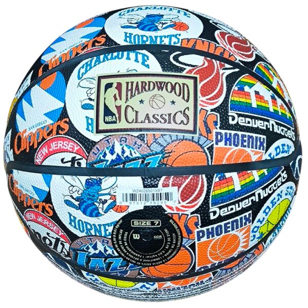 - Pelota retro que te trasporta al pasado gracias a logos icónicos de los mejores clubes de basket de la NBA.